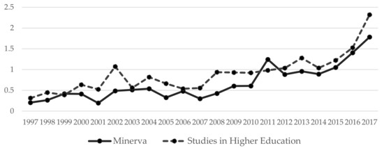 Change in the 5-year JIF of Minerva and SHE from 1997–2017. Source: Journal Citation Reports (https://jcr.clarivate.com, accessed on 22 January 2020).