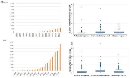 Figure 2 shows the general pattern of citations across the two journals between 1990 and 2017. The total number of citations across both journals increased dramatically after the introduction of WURs in 2003. The boxplots display the distribution of the average numbers of citations per year for each WURs period. The bar in the middle of the box is the median, and the upper and lower boundaries of the box indicate the third and first quartiles in the data distribution, respectively. The boxplots for both journals showed that papers published during the implementation period had a higher probability of citation than those published during the antecedent period. For example, the citation probability of papers published in Minerva during the WURs adaptation period (2011–2017) almost approximated the median number of citations received by papers published in the same journal during the WURs implementation period (2004–2010), while it is almost at the same level as the WURs antecedent period (pre-2004) for SHE.