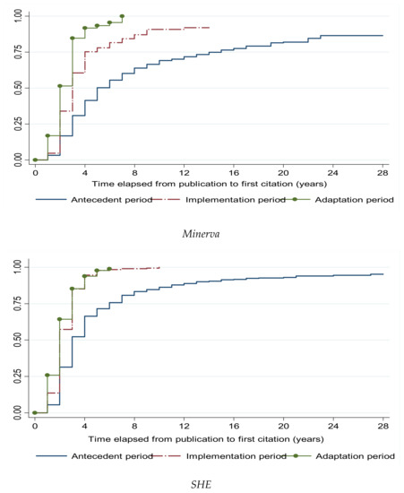Figure 3 shows the Kaplan–Meier failure estimates that measure the time elapsed from the year of publication to the year of the first citation for papers published in the three WURs periods. The estimates for Minerva indicated that, among papers published in the antecedent period, 50% and 75% would be cited after 5 years and 15 years, respectively. In comparison, the probability of receiving a first citation for papers published in the same journal during the implementation period reached 50% after three years and 75% after four years, while that for papers published in the adaptation period reached 50% after two years and 75% after three years. The estimates for SHE showed that the probability of receiving a first citation reached 50% after three years and 75% after six years for papers published during the antecedent period, while that for papers published during the implementation or adaptation periods reached 50% after two years and 75% after three years.