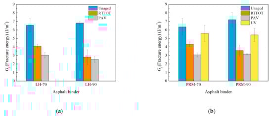 - The influence of thermal-oxidation and UV aging on the mechanical and chemical performance of PRM-90 is more obvious than those of PRM-70. The use of low-penetration-grade bitumen and ensuring an adequate reaction are beneficial to enhance the aging resistance of PRM-modified bitumen. Due to the effect of aging, the change of high-temperature performance of PRM-modified bitumen is great, followed by the low-temperature performance and the anti-fatigue performance. The mechanically relevant rheological aging index (CAI) and fracture energy index (FEI) are recommended to be used in the evaluation of aging properties.