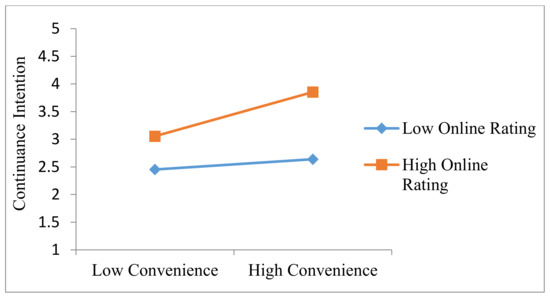 Table 5 illustrates the models to check the moderation effects, and the results accounted for in the table confirmed the moderating effects of online ratings. Regarding the effect of interaction variables, online ratings positively influence the relationship between satisfaction and continuance intention (β = 0.175, p < 0.05). Consequently, online ratings also positively moderate the relationship between convenience and continuance intention (β = 0.153, p < 0.05) as predicted.
