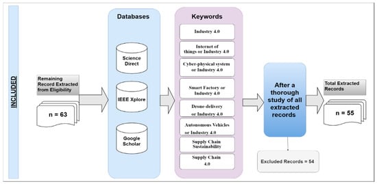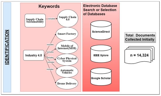 The first step is developing a search strategy; the search strategy for this research study was tailored to three databases (ScienceDirect, IEEE Xplore, and Google Scholar). The search keywords were defined as: Industry 4.0, Internet of things, automatic guided vehicles, unmanned aerial delivery (drones), cyber–physical system, smart factory, supply chain sustainability, and supply chain 4.0. Initially, all 14,324 documents were extracted by following the search strategy in the Identification Process.