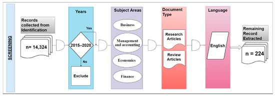 The second stage of the Prisma framework is screening in which the search criteria is defined and performed. The search mainly focuses on collecting the existing literature on Industry 4.0 technologies and supply chain sustainability. The search span was set from 2015 to 2020 and all the documents before 2015 were removed because we wanted to do a literature review on recent data available. The research fields for this research study were selected and narrowed down to business, accounting and management, economics, and finance. Only the documents that were full articles and review papers were selected, and the language of research papers was set to English. A total of 14,100 documents were excluded at the screening stage. A total of 224 research papers were extracted at this stage and forwarded to the next stage. The screening process of the Prisma framework is explained in Figure 3.