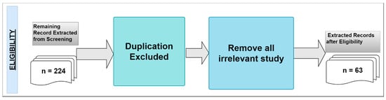 Furthermore, after this filtration process, 161 papers were excluded in the quality assessment stage and the remaining 63 articles were eligible for the inclusion or exclusion stage. The quality assessment procedure is shown in Figure 4.
