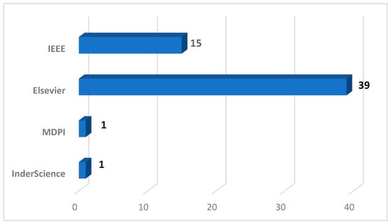 In this stage, contributions made by different publishers were identified. It can be seen from Figure 6 that Elsevier is at the top, with the maximum number of publications of 39 papers. IEEE stands at the second highest with 12 papers and other papers are published by MDPI and InderScience.