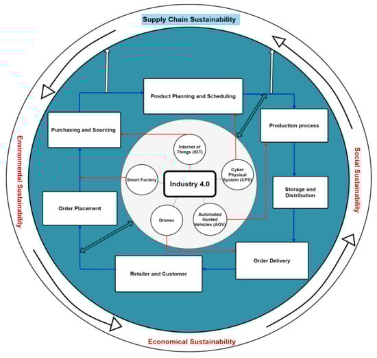 The above section provides detailed insight on the literature through a comparison of the focus, methods, and results of different studies. After a thorough review, we have developed a framework that explains the role of Industry 4.0 technologies in the supply chain process which led companies to achieve supply chain sustainability. This study includes five Industry 4.0 technologies including the smart factory, the Internet of things (IoT), the cyber–physical system, automatic guided vehicle (AGV), and drones.