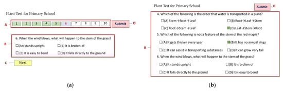The CBT in this study was presented in the Web browser. The computerised presentation types of the CBT were divided into single-item presentation (Figure 1a) and multiple-item presentation (Figure 1b), where Zone A is the item number area, showing the items already answered (green background), the items now being answered (blue background), and the items yet to be answered (white background). Zone B is the item and option presentation area, where the examinee can click on the box of an option to choose it as the correct answer; Zone C is pressed to present the next item after the answer is confirmed; and Zone D is used to submit all answers.