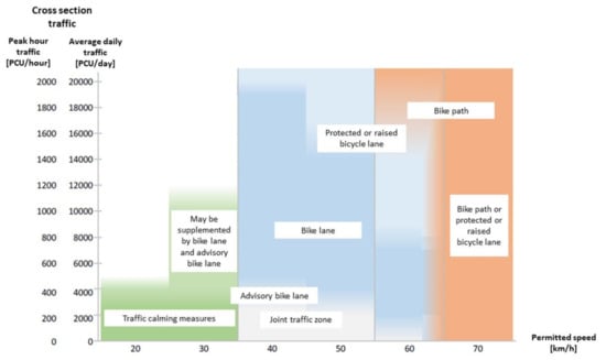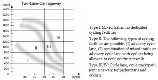 The German guidelines use a similar approach (see Figure 2). Mixed traffic (denoted as Area I) is possible with a speed limit of 30 km/h and with maximum 8000 vehicles/24 h or with a speed limit of 50 km/h and with maximum 4000 vehicles/24 h without any additional measures.