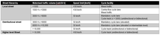 Dedicated cycling facilities are recommended for high volumes of motorised traffic and high speed limits. Cycle tracks/paths and cycle lanes bring vertical and/or horizontal separation. Budapest and Lisbon recommend mandatory cycle lanes with intermediate volumes/speed of motorised traffic and cycle tracks/paths with higher volumes/speed of motorised traffic [17,18]. The Netherlands and Malmö generally recommend off-carriageway cycle tracks/paths for main streets [19,21]. The German recommendations equally recommend cycle lanes and cycle tracks/paths for streets with high volumes of motorised traffic and speed limits [23].
