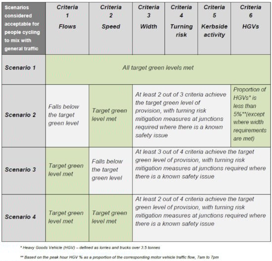 Transport for London (TfL) developed recently a new approach to decide whether or not cyclists can be mixed with motorised traffic [24]. TfL defines target green levels and minimal requirements for six criteria and a scheme to decide which level has to be met for each of these criteria in different combinations, these are summarised in 4 scenarios.