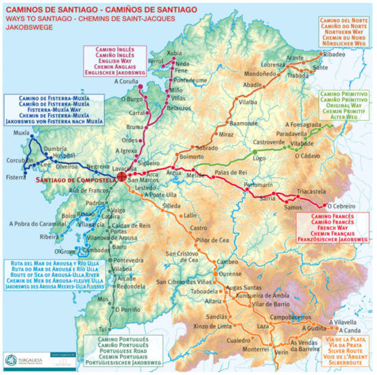 According to UNESCO [9], the Route of Santiago de Compostela (commonly known in Spanish as “Camino de Santiago”) is an extensive interconnected network of pilgrimage routes departing from different points in Europe and whose ultimate destination is the tomb of the Apostle James the Greater in Santiago de Compostela in Galicia, which is a region located in Spain’s northwest. Therefore, in this text, we have opted for preserving the denominations “Route of Santiago de Compostela” and “Route of Santiago” for short, following the translation on UNESCO’s website; however, the name can also be translated as “Pilgrim’s Way to Santiago,” “the Way of St. James,” or “Saint James’ Way,” among others. A multilingual map of the different routes to Santiago within the region of Galicia can be found in Figure 1.
