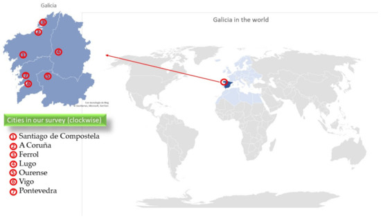 The overarching objective of this article is to present the results of a study that aimed to analyze the relationship between the perceptions of residents in Galicia toward tourism on the Route of Santiago and their interest in the development of this activity. The empirical study was carried out in the early months of 2021, at the beginning of the Xacobeo Holy Year, based on a questionnaire (see Appendix A) sent to residents of the seven major cities of Galicia that are in the itinerary of the Route of Santiago: Vigo, A Coruña, Lugo, Ourense, Pontevedra, Ferrol, and Santiago de Compostela. The map in Figure 2 shows the locations of these seven cities in the map of Galicia, as well as the Region of Galicia in Spain, Europe, and the world.