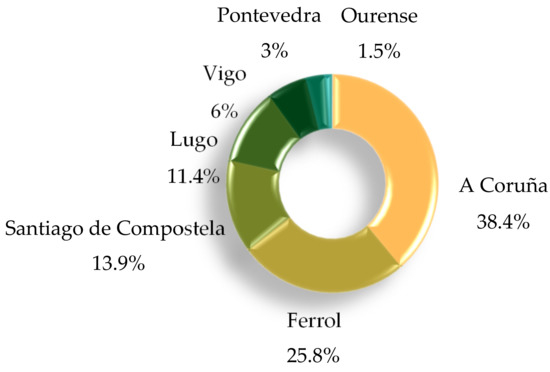 As shown in Figure 3 (study sample by city), most of the responses were collected in the city of A Coruña (almost 40% of the total), followed by the city of Ferrol with about 26% and Santiago de Compostela with almost 14% of the answers. Ourense and Pontevedra were the cities where fewer responses were received: 1.5% and 3%, respectively. The scarce number of responses generated a limitation in the study since the statistical analyses for these two cities were not significant owing to the low response level. In between the two extremes, 6% of the responses corresponded to the city of Vigo, whereas 11,4% of the population sample came from the city of Lugo.