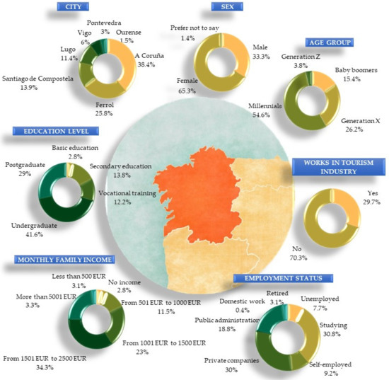 As for their employment status, the sample was formed chiefly by working people (almost 60%) who were employed by public administrations (18%) or private companies (30%) or were self-employed. The remaining 40% were either retired or unemployed, as was the case of many students in Santiago de Compostela, which hosts a public university. In addition, the sample was made up of people whose monthly family income was over 1501 EUR. This figure is consistent with the average salary in Galicia, which according to the last of Adecco’s Salary Monitors available at the time of writing this article, was 1586 EUR per month in 2020, compared with the average for Spain, which stood at 1658 EUR per month, and for the average gross ordinary salary in the 28 countries of the European Union, which amounted to 2091 EUR per month [39]. Finally, an overwhelming majority of the respondents did not work in the tourism, travel, and hospitality sectors, with less than 30% of the respondents doing so.