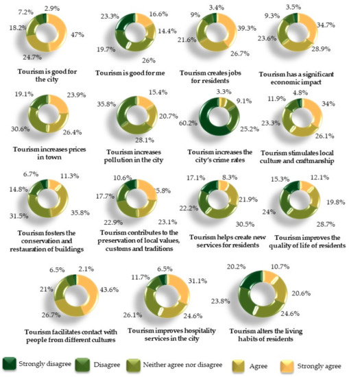 From the answers to the statement “Tourism is good for the city,” we concluded that 71.7% of respondents expressed a positive opinion about tourism, agreeing that tourism on the Route of Santiago was good for their city. In contrast, only 10.1% expressed disagreement with the statement. Furthermore, out of the 15 variables used, this statement was the one that obtained the highest average (3.98), which indicated that respondents to the survey recognized the economic importance of tourism for the region of Galicia.