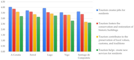 As for cultural heritage, respondents from Santiago de Compostela agreed less with the statement “Tourism on the Route of Santiago contributes to preserving local values, customs, and traditions” than respondents from A Coruña, Ferrol, Lugo, and Vigo (Figure 6). Furthermore, A Coruña was the city with the strongest perception about the ability of tourism to bolster the conservation and restoration of historic buildings, in contrast to respondents from Santiago de Compostela, who were the most critical ones. The fact that Santiago is a UNESCO World Heritage site that receives more tourists than any of the other four cities may condition this perception.