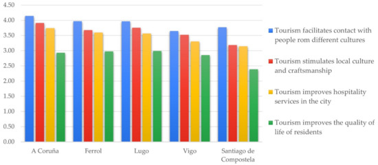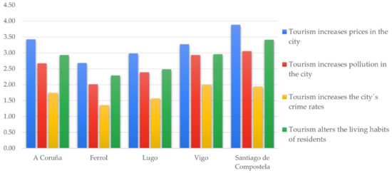 After this initial presentation of the results for the whole of Galicia, we now proceed to present the perceptions of the effects of tourism in the cities surveyed, both positive and negative. First, however, it should be noted that out of the seven cities initially chosen, two of them (Ourense and Pontevedra) were not considered in the following comparisons because the number of answers collected from these cities was insufficient and, therefore, statistical analyses did not produce significant results with such a low level of responses.