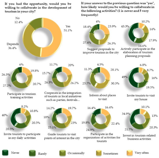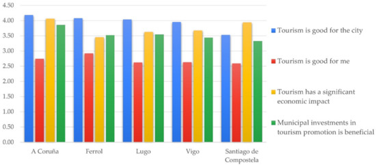 As a result, we found out that there were no significant differences between the perceptions in the five cities surveyed: A Coruña, Ferrol, Santiago de Compostela, Vigo, and Lugo. Thus, it can be asserted that the population in the study sample that responded that they were willing to collaborate in the tourism development behaved in the same way.