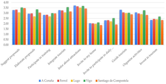 Amongst the ten statements related to the activities they would be willing to carry out to contribute to the development of tourism in Galicia, the highest averages were obtained for the statements: “Inform about the places to visit” and “Suggest proposals to improve the tourism in the city.” As such, we identified that people living in Galicia, on the one hand, valued the visitor’s experience since they were willing to help by getting in direct contact with visitors in order to offer information about places to visit. Nevertheless, on the other hand, they were also willing to participate in tourism management by contributing their proposals to improve this activity (Figure 11).