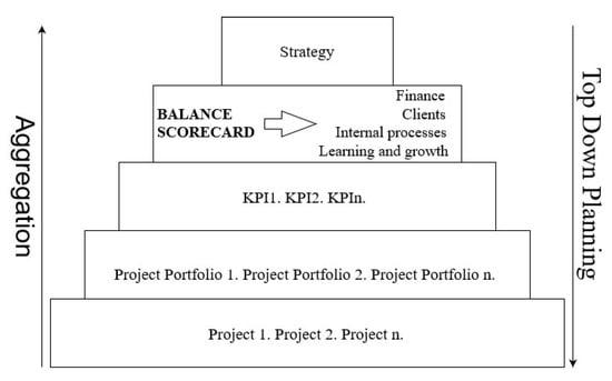 Plan–fact analysis ratios are used to evaluate the lowest level travel projects. The KPIs for these projects include plan–fact analysis ratios and plan–fact analysis ratios for KPIs that can only be interpreted at the project portfolio level. The average of these indicators represents the result of the examined project portfolio. Aggregate KPIs at the third level are the weighted average of specific indicators (e.g., ROE, ROA, CSR, etc.) related to the projects in the project portfolios. The value of the four different aspects of the balanced scorecard at the fourth level is the weighted average of the aggregated KPIs for those perspectives. The strategic performance index can be calculated as a weighted average of the values of the BSC perspectives (Figure 1).