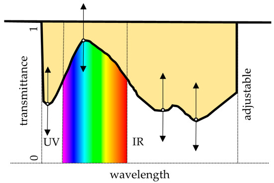 The term “smart window” is used to describe the whole range of different technologies that can either (i) self-regulate the passage of solar radiation (thermochromic and photochromic) or (ii) regulate the transparency by the application of an external voltage. This change is achieved either by regulation of the absorbance or the reflectance, as addressed in detail by Jelle [24]. Jelle also presents two figures, illustrating the difference between the change in transmittance by a movable reflectance edge and the change in transmittance by a movable absorbance edge. Moreover, technologies exist that feature combined regulation of both absorbance and reflectance. An exemplary diagram—in a different graphic form—is given in Figure 1 for the illustration.