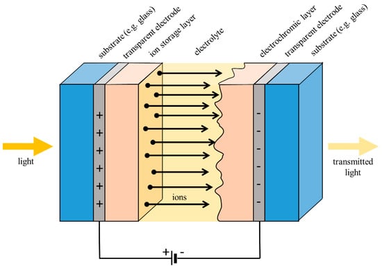 Electrochromic devices typically consist of five thin layers that are located (sandwiched) between two panes of glass or flexible polyester foil: two external layers of transparent conductive films (usually indium tin oxide, ITO) and the counter electrode (Ni-oxide-based film), electrolyte, and electrochromic electrode in between (W-oxide-based film). The counter electrode is used for ion storage, the electrolyte for conducting ions, and the electrochromic electrode for attracting ions. When the electrical current is applied, the ions stored in the counter electrode (bleached state) migrate through the electrolyte to the electrochromic electrode, resulting in the colouration (coloured state). The mobile ions should be small. Hydrogen protons (H+) or lithium (Li+) ions are commonly used [18]. EC device can be considered as an electrical battery in which the optical absorption is related to its charge; therefore, the crucial component of an ECD is an electrolyte, which can be liquid, gel, or solid, as addressed by Cannavale et al. [56]. The most popular ECD architecture is pictured in Figure 2.