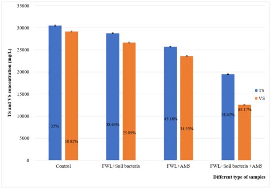 Total solid content (TS) and volatile solid content (VS) concentrations of different waste samples at 15 days, pH 10.5, and 55 °C. The removal of TS and VS is illustrated as a percentage. FWL: food waste leachate.