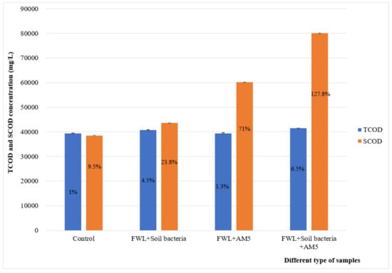 TCOD and SCOD concentrations of different samples at 15 days, pH 10.5, and 55 °C. The change of TCOD and SCOD concentration in each trial sample was observed as a percentage.