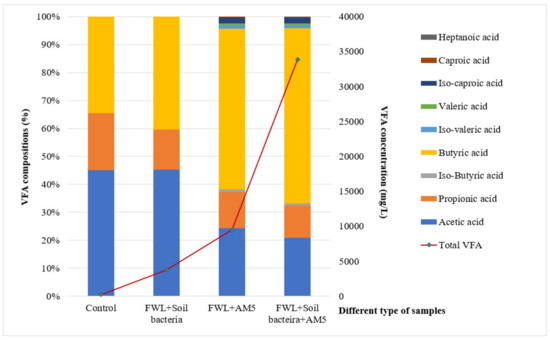 The total VFA concentrations in three settings (FWL + soil soln., FWL + AM5, and FWL + soil soln. + AM5) were 3760 mg/L, 9485 mg/L, and 33,849 mg/L, respectively.