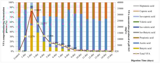 Total VFA concentration and proportion of VFA components produced at various pH values at 55 °C. Measurements were recorded each day during 15 days of anaerobic fermentation (AF) process.