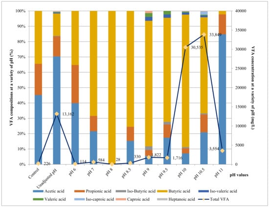 Previous investigations have reported that pH is the most critical parameter that influences the growth rate of microorganisms involved in both acidogenic and hydrolysis processes [60,61]. In another study, the AD process was conducted at the same mesophilic condition, pH 6, HRT (hydraulic retention time) of 5 days, and using a combination with mature compost; the VFA yield from food waste obtained was lower than 20 g VFA-COD/L [18]. In contrast, alkaline conditions were found to be optimal for more complex organic materials [62,63]. Additionally, recent studies have speculated that pH affects the metabolic pathways and influences the VFA compositions [64,65]. Jiang et al. indicated that acidic conditions are more favorable for VFA production from more easily degradable materials or sorted food waste. It was found that at an initial pH 6 with no control during the fermentation process conducted at 45 °C and HRT of 5 days, the VFA concentration reached 47.2 g/L due to the high protein content of the organic matter used, whereas valerate component was not produced at an unadjusted pH and accounted for 0.15%, 9.52%, and 3.59% of the VFA content at pH 5, 6, and 7, respectively [53]. In another study, pH 10 seemed to favor acetic acid production, while butyric acid was the main product below pH 5 and valeric acid was detected at the highest concentration of 40 mg/L at pH 6. Propionic acid production was observed to be stable compared to other VFA components when subjected to a change in pH [66]. Herein, the butyric acid in this study reached the highest concentration at pH 10, with 26,368 mg/L, while it was 21,218 mg/L at pH 10.5 and then decreased to 1921 mg/L, 1490 mg/L, and 1164 mg/L at an unadjusted pH, pH 9, and pH 9.5, respectively. This value decreased sharply at acidic and alkaline conditions.