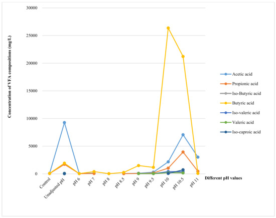 The concentration of VFA components produced at various pH values.