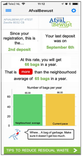 Goal comparison feedback provides feedback on one’s current behaviour compared to a goal. For example, the number of waste bags your household produced in the past weeks compared to the goal you set on how many bags you aim to produce during this period. Research suggests that feedback with goal comparison increases energy-saving behaviour and reduces actual energy consumption [7,20,21]. Similarly, it has been found to reduce the use of concrete and timber waste at the source [22]. However, research is needed to test the effect of goal comparison feedback on household waste minimization.