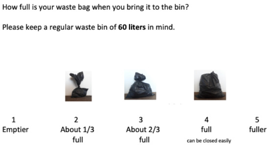 Residual waste. To measure the amount of residual waste produced during the six months of the intervention period and six months before the intervention, we asked participants two questions: ‘In the past months, how many days did it take you on average to fill up a residual waste bag?’ and ‘How full is your residual waste bag when you take it out? Please keep a regular waste bag (60 litres) in mind’. Participants could answer how full their bag is on average on a five-point scale, including clarifying pictures from 1 (emptier; 10 litres), 2 (1/3 full; 22.5 litres), 3 (2/3 full; 35 litres), 4 (full, can still be closed; 47.5 litres), 5 (fuller; 60 litres; see Figure 2). We calculated the total number of litres during six months (Mt0 = 1158, SDt0 = 1109; Mt1 = 911, SDt1 = 1011).