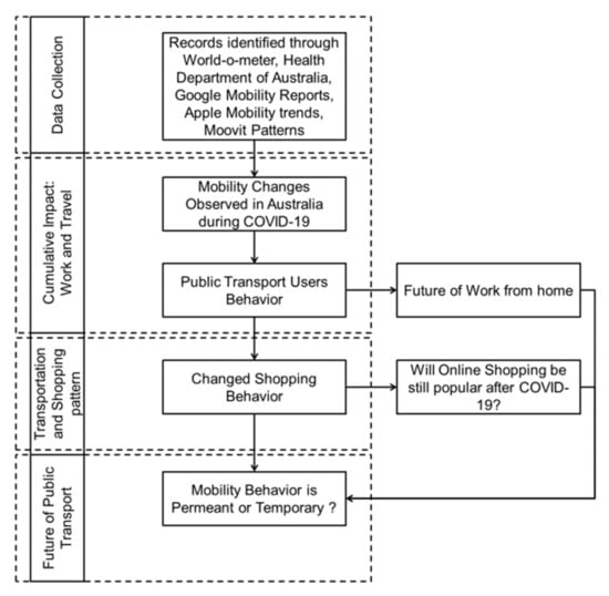 The following sections will include a detailed overview of how the coronavirus pandemic has changed the lives of people in Australia. A carefully structured methodology has been used for extracting relevant literature and data related to change in the pattern of office work, the work-from-home culture, shopping patterns and the use of transportation. All these data points will provide a means to analyse the shift that has occurred in the lives of Australian citizens. Understanding this shift will further provide a window for understanding what the post-pandemic future might look like for Australia. The paper is organised as follows: Section 2 presents the methodology followed to collect data for the study. Section 3 presents the impact on transportation. Section 4 discusses the economic and social impacts. Section 5 summarises the flexible working arrangements. Section 6 examines the shopping patterns of people. Section 7 gives a brief discussion of the studied behavioural pattern, and Section 8 summarises the outcomes and limitations of the study.