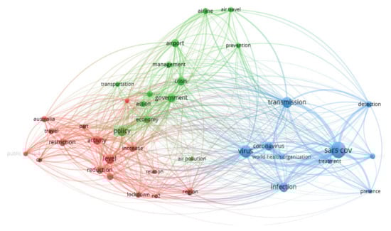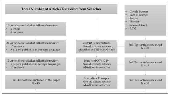 A detailed literature search was carried out to collate the most appropriate data for this study. Vos Viewer software is a tool for constructing and visualising bibliometric networks and was used to develop Figure 2, which shows some of the most frequently used keywords in the literature. From the selection of keywords, it is evident that the research rotates around the effects of COVID-19 on the transport system. A list of keywords was generated to refine the overall selection procedure based on the 5 Ws and the H idea generation strategy, i.e., who, what, when, where, why and how COVID-19 is impacting mobility. The keywords were used both separately and in combinations to extend the article-searching process and to retrieve a maximum number of articles from the search engines. Various search engines including, Google Scholar, Scopus, ACM PubMed, MedRxiv, MDPI, Elsevier, ScienceDirect, Web of Science and SSRN, were used for the retrieval of relevant articles. However, to perform exhaustive research, various search phrases were formulated to be used for different websites, for the extraction of a maximum number of relevant articles (Figure 3). Some of the search phrases formulated for the current study included “COVID-19 policies”, “COVID-19 restrictions”, “coronavirus response”, “impact of COVID-19”, “effects of coronavirus”, “coronavirus and public transport in Australia”, “coronavirus effect on air travel in Australia” and “coronavirus impact on freight transport in Australia”. Finally, articles, letters and review papers that were published in foreign languages were excluded from the extracted literature that was intended to be used for the current study []. A final list of 45 articles was selected for the current study to carry out the detailed background research and analysis. Statistical analysis was performed on the selected data sets using mean, mode and standard deviation parameters, which were followed by graphing the results to explore the trends for the studied parameters.