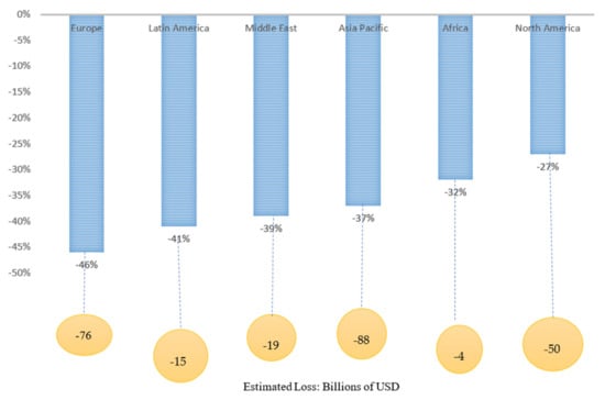 With the latest travel restrictions imposed in many countries, the travel industry has also faced massive revenue losses. The airline industry is an eight-trillion-dollar industry supporting more than one billion trips annually [,]. However, in the wake of COVID-19, this industry has lost 250 billion dollars owing to the current travel restrictions and global recession. In the current year, the airline industry was confronted with a 44% decrease in revenue as compared to the revenues for the year 2019. The graph illustrated in Figure 4 shows the percentage difference in the global revenues of the travel industry from 2019 to 2020 [,,]. It is shown that Europe was confronted with the highest loss in revenues from the travel industry. Adekunle et al. (2020) developed a stochastic metapopulation model to investigate the spread of COVID-19. It was observed that the COVID-19 outbreak was restricted by reducing the importation by 79% due to travel restrictions.