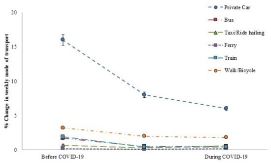 Figure 5 depicts the changing travel behaviours for different modes of transport in Australia (Moovit mobility patterns). The number of trips for private vehicles reduced from 17 to 8% trips per week during COVID-19. Public transport such as bus and train usage was significantly reduced from 16 to 7% of trips per week. Before COVID-19, the proportion of household trips by private cars was stable, with 70% of the people travelling by car, while during COVID-19, the usage of private cars was comparatively higher than the rest. Active transport of household trips increased from 14 to 20% but, however, was lower in absolute terms [,].
