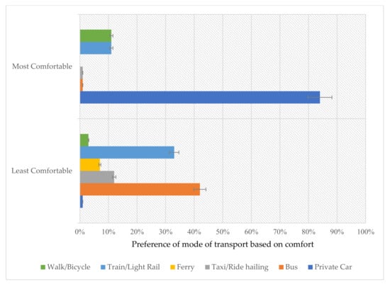 Figure 6 depicts the perception of the public about various modes of transport in terms of comfort (i.e., either comfortable or least comfortable) during the COVID-19 crisis (Google mobility reports, Moovit mobility patterns). The figure clearly shows that people feel most comfortable using a private car, while train and bus usage was found to be least comfortable, showing percentages of 33% and 42%, respectively. These perceptions are dependent on social demographics, with different age groups preferring to ride by taxi, ride sharing or cycling as comfortable means of transport. The respondents scored the mode of transportation from least to most comfortable.