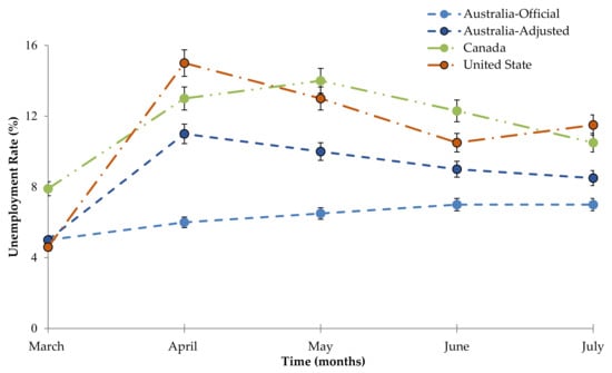 With the unemployment rate soaring up during COVID-19, drastic policy measures were taken up by different countries to reduce the unemployment rates. In the UK, the unemployment rate was 3.9% for April–June 2020, slightly higher than 3.89% in April–June 2019, while in June 2020, around 9.3 million people opted for a job retention scheme and almost 2.7 million people claimed self-employment income support grants. The largest decrease in weekly hours worked was observed, and the number of benefits claimed increased from 1.24 to 2.63 million people. An estimate of the Australian unemployment rate was made and compared with the US and Canadian unemployment rates [] (Figure 8). It is estimated that a downward trend after the April surge may be difficult to maintain, with the emergency relief fund given to the people. The adjusted unemployment rate is calculated on a monthly basis and is a statistical method of removing the seasonal component of a time series that is used when analysing non-seasonal trends.