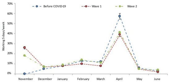 The restriction due to coronavirus significantly impacted the work availability and the workplace where the employees completed their work, as investigated by Beck et al. (2020). Around 476 respondents who work were interviewed for wave 1, while for wave 2, data were gathered from 705 respondents who travelled to work. For the people who were working 5 days a week before the onset of the pandemic, the statistics reduced from 58 to 39% after wave 1 (30 March to 15 April), while during wave 2 (23 May to 15 June), the statistics slightly improved to 41%. Furthermore, out of the people who were working 1 day per week before coronavirus restrictions, about 26% of workers were found to be unemployed during wave 1, while the number reduced to 17% during wave 2 (Figure 10) [].