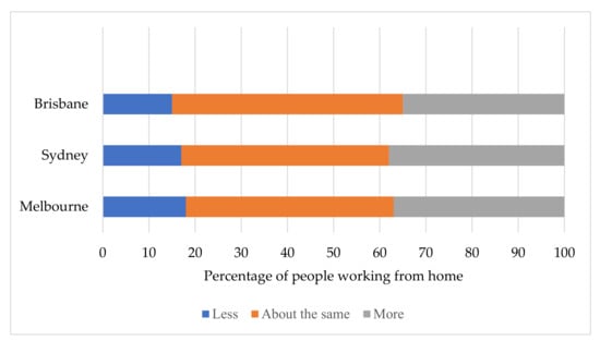 A recent online survey was sponsored by Transurban and conducted by Nature, Australia, the United States and Canada. This survey aimed to monitor the mobility trends in some major cities globally, including Brisbane, Sydney, Melbourne, Montreal and Washington. The survey included the data and events till 07 August 2020. One of the major questions posed to the respondents was that once the COVID-19 risk has passed, how much will they work from home (Figure 11). The results focused on Australia show that among the Brisbane respondents, almost 14% are less likely to work from home after COVID-19, whereas 44% will work the same hours and 41% are more inclined towards working in an office. Sydney and Melbourne’s respondents showed almost similar thoughts regarding their possibility of working from home or office. The remaining 15% think they will be more likely to work from home, whereas most are inclined to work regular hours in a centralised workplace. Overall, almost 45% of the respondents had worked remotely or were continuing to work remotely before the arrival of COVID-19 at the start of 2020.