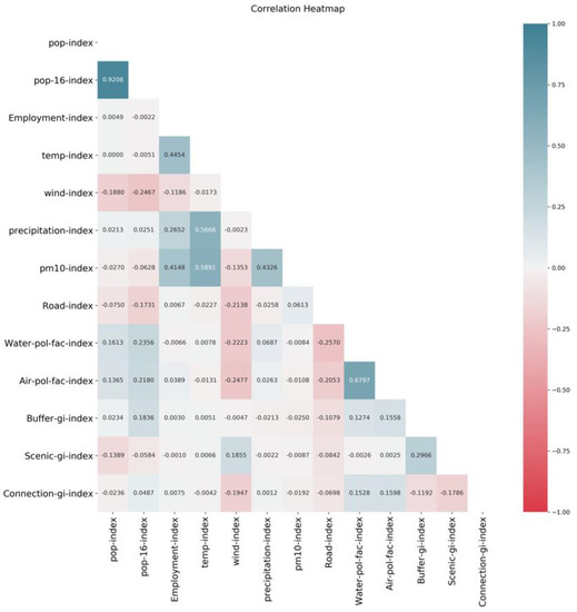 As a result of this Equation (3), the index value is located between 0 and 1 regardless of the unit and distribution of the corresponding variable origin values enables comparison between variables. However, if the characteristics of the variables that make up the data have a negative meaning, such as the values of the pollutant facilities, air quality, and road rates, the corresponding indicators were used as minus the original equivalence value as shown in the Equation (4):