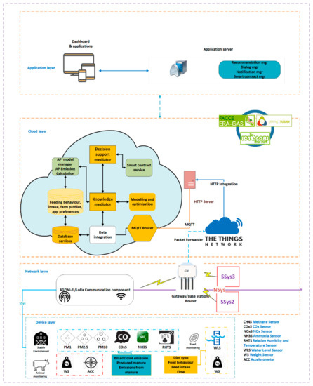 The network layer consists of the communication component and the gateway. There are multiple options for communication and the gateway component. This flexibility enables a large set of use cases and provides adaptability without requiring any customization. The main element of the network layer is the gateway, which links the device layer with the cloud layer. The gateway used is Dragino DLOS8 integrated and registered together with the wireless sensor nodes in The Things Network [35]. In Figure 1, SSys comprises the devices (stable and animal sensors, devices for assessing the feed and water intake) and the network devices. To the gateway, one may connect more SSys, for adjacent farms.