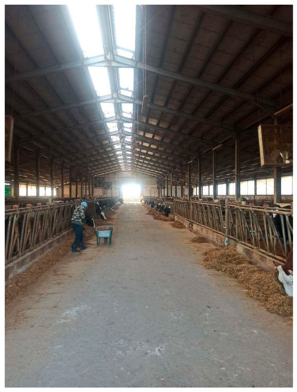 The case study was conducted on a 200 head dairy cow farm, Milanovici Farm, situated in Moșteni commune, the northeastern part of Teleorman county, in the Friza and Montbeliard breeds. The structure of the herd is as follows: 110 dairy cows, with an average daily production of 30 kg/head/day, live body weight 700 kg; 50 heifers and primiparous heads, live body weight 600 kg, and 40 young heads (0–9 months), average live body weight 200. All categories are bred-free housing, in the same stable, with dimensions of 70 m × 32 m × 9 m (length, width, height), including calves (0–3 months). The animals have no paddock and do not go to pastures at any time of the year.