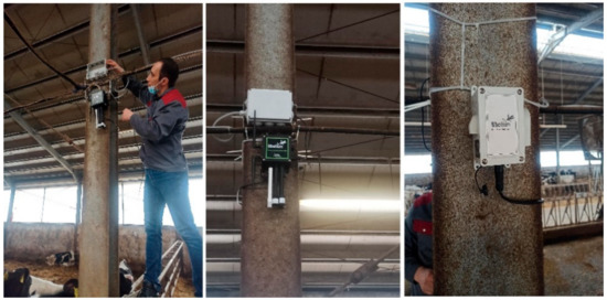On-farm wireless sensors transmit unique information to determine the source of AP emissions and the costs associated with these emissions in the form of taxes. In Figure 3, it can be observed how carefully the IoT devices positioning was chosen so that they do not disturb the everyday activities of the animals.
