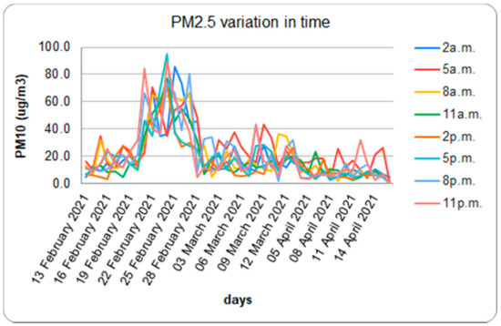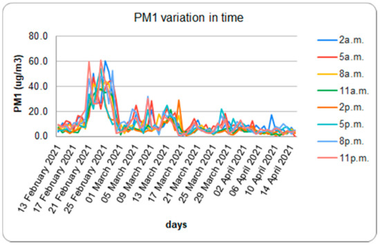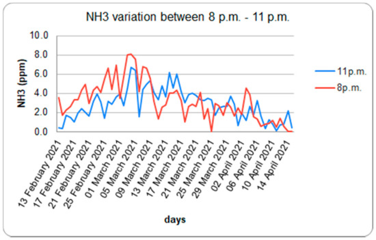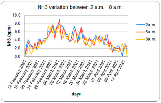 Animal farms produce a series of air pollutants consisting of a mixture of gases rich in ammonia (NH3), carbon monoxide (CO) and microscopic particles known as particulate matter (PM), usually contaminated with microorganisms and toxins [6] (pp. 298–302). Ammonia is an irritating gas produced, under the action of enzymes, from animal manure, being an essential precursor of secondary inorganic aerosols, contributing significantly to the concentration of PM in the atmosphere, the most important being PM10 (microscopic particles less than 10 microns in diameter) and PM2.5 (microscopic particles less than 2.5 microns in diameter), the latter being easily transported over long distances [7]. PM1 represent ultrafine particles with an aerodynamic diameter of less than 1 micrometer. Ultra-fine dust is the most damaging variant of fine particles because the particles penetrate directly through the lungs into the bloodstream and are thus spread to the organs. CO is an odorless, colorless, tasteless gas. Higher concentrations of carbon monoxide in the air can cause weakness, confusion, flu-like symptoms with nausea and vomiting, and sudden death to young animals.