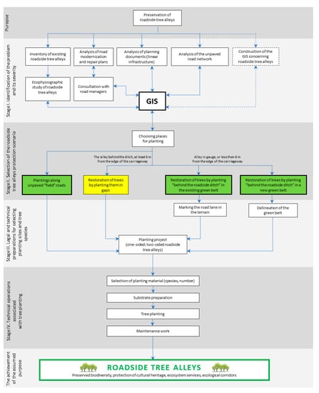 The proposed guidelines in the form of an algorithm were divided into four stages. Stages I and II include tree inventories and analyses that facilitate the selection of the optimal roadside tree protection scenario. Stages III and IV involve an analysis of legal measures and technical requirements relating to selected scenarios for the protection of roadside tree alleys.