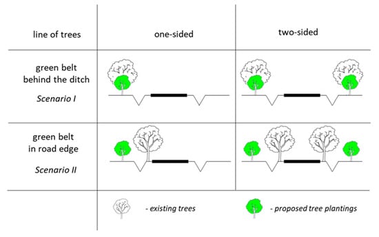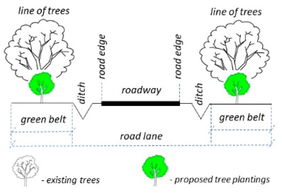 Trees can be planted only in green belts on land under roads (Figure 2). The Act of 21 March 1985 on public roads [] defines land under roads as a delineated strip of land that accommodates a road, including the space above and under land surface, as well as the structures and technical infrastructure for managing, guiding and facilitating vehicular traffic.