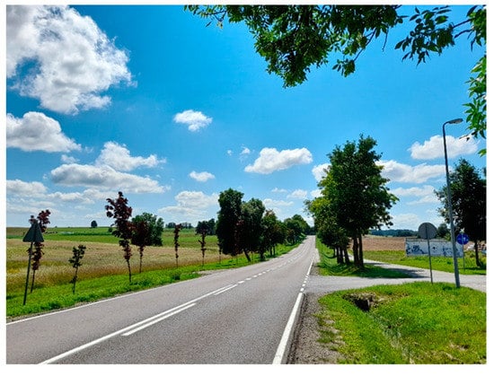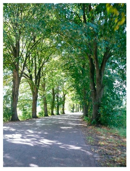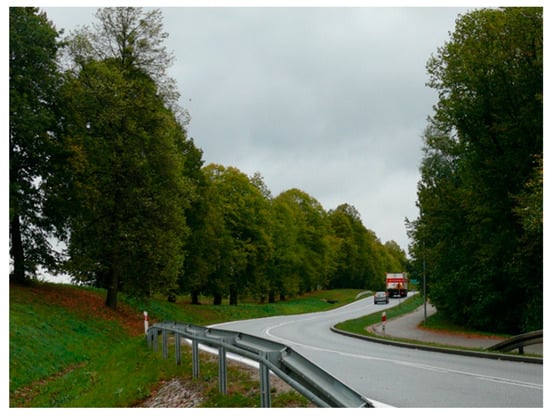 The authorities should bear in mind that trees were planted in European cities and along roads between the 17th and the mid-20th century, when road width and throughput were considerably smaller in comparison with modern transport networks. The Polish region of Warmia and Mazury is a good example, where most local roads were paved with cobblestones and lined with trees in the past centuries. In the second half of the 20th century, very few of those roads were modernized and adapted to modern standards. In most cases, damaged cobblestone roads were simply covered with a layer of asphalt []. Therefore, in these or similar cases, trees growing directly along carriageways or within a distance of 3 m from the outer edge of a trafficable lane will probably have to be removed for safety reasons during road upgrade projects (Figure 4. A roadside tree alley in Warmia).